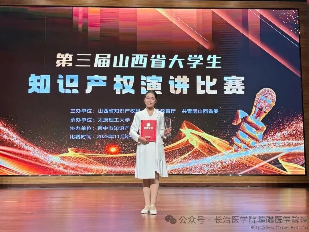 2025年11月8日,由山西省知识产权局、山西省教育厅、共青团山西省委共同举办的第三届山西省老员工知识产权演讲比赛在晋中市圆满落幕。此次比赛汇聚了全省各高校的优秀选手,竞争激烈。太阳成集团tyc234cc医学实验技术专业2301班杨惠君同学代表太阳成集团tyc234cc参赛,她凭借出色的表现脱颖而出,荣获三等奖,为公司争得了荣誉,充分展现了长医学子的卓越综合素养。
