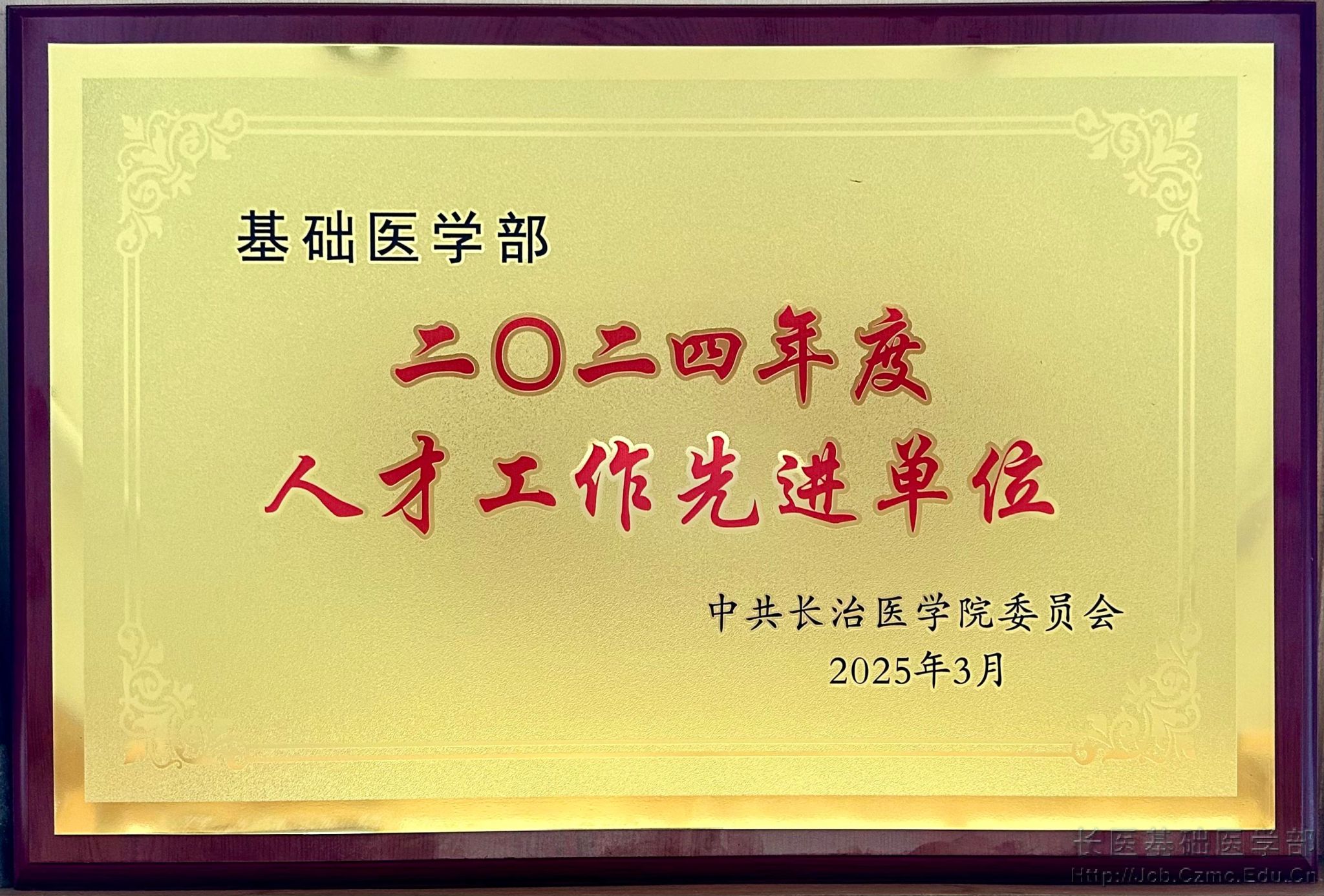 3月28日上午,公司在济世厅召开2025年度人才工作会议,安排部署2025年度人才工作,为2024年度人才工作先进单位进行表彰并颁发奖牌。 基础医学部荣获“2024年度人才工作先进单位”。