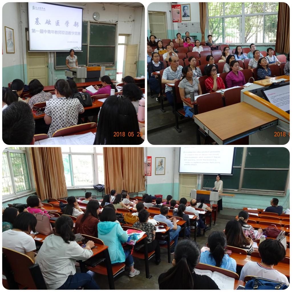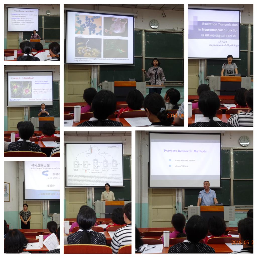 为鼓励中青年教师开设双语教学课程,加强双语教学改革和研究,创新医学教学模式,提高双语教学授课水平和质量,5月29日下午,基础医学部举办了“基础医学部第一届中青年教师双语教学比赛”。比赛由张雄鹰副主任主持,基础医学部各教研室任课教师观摩了比赛。