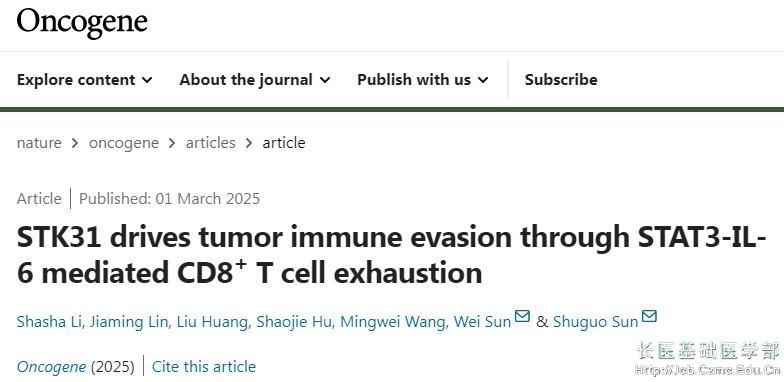 3月1日,基础医学部青年教师李莎莎与华中科技大学同济医公司孙书国教授合作的最新研究成果《STK31 drives tumor immune evasion through STAT3-IL-6 mediated CD8+ T cell exhaustion》在Nature子刊《Oncogene》发表。基础医学部青年教师李莎莎为该论文第一作者,华中科技大学为第一完成单位,太阳成集团tyc234cc为第二完成单位。项目经费由国家自然科学基金资助。该研究首次阐明STK31通过STAT3-IL-6通路驱动CD8+ T细胞耗竭依赖的免疫逃逸,为肺癌的靶向免疫治疗提供了新策略。