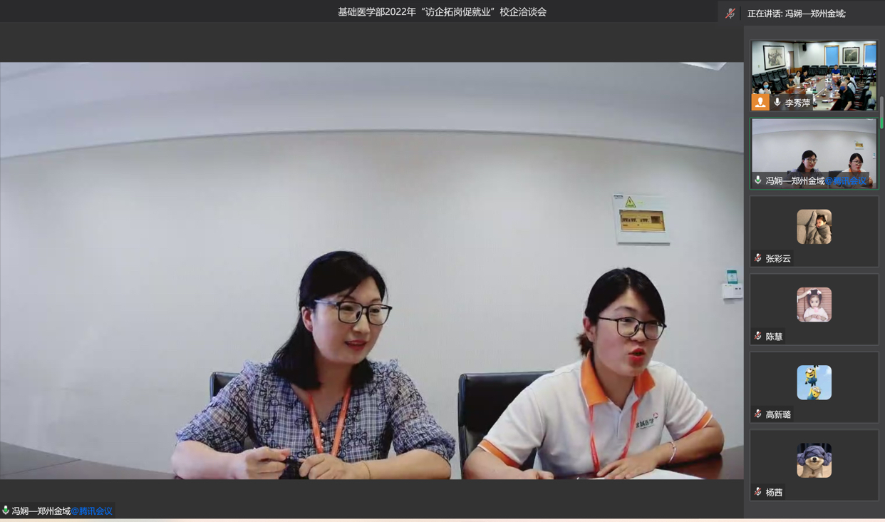 按照《太阳成集团tyc234cc访企拓岗促就业专项行动方案》决策部署,为积极拓展毕业生就业渠道,做好毕业生就业服务工作,6月6日下午,基础医学部与郑州金域临床检验中心(以下简称郑州金域)开展“访企拓岗促就业”线上校企洽谈会暨专场招聘会。公司党委副书记、董事长王金胜,副董事长李长江,人才招聘指导处处长王华莅临指导。郑州金域人力资源总监徐娜、招聘经理冯娴以及基础医学部党政领导、综合办工作人员、全体辅导员、2022届和2023届毕业生参会。会议由基础医学部副主任李晨主持。