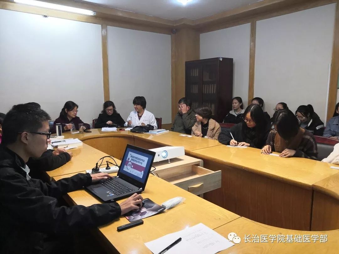 基础医学部党总支书记梁建君、基础医学部主任张翠英教授、基础医学部党总支副书记李萍、基础医学部副主任张雄鹰教授、生化教研室主任裴晋红、形态党支部书记李建斌、生理办公党支部书记李淑芬、分团委书记兼辅导员李明老师以及员工会、17级、18级员工代表担任本次评委,部分同学观摩大会。