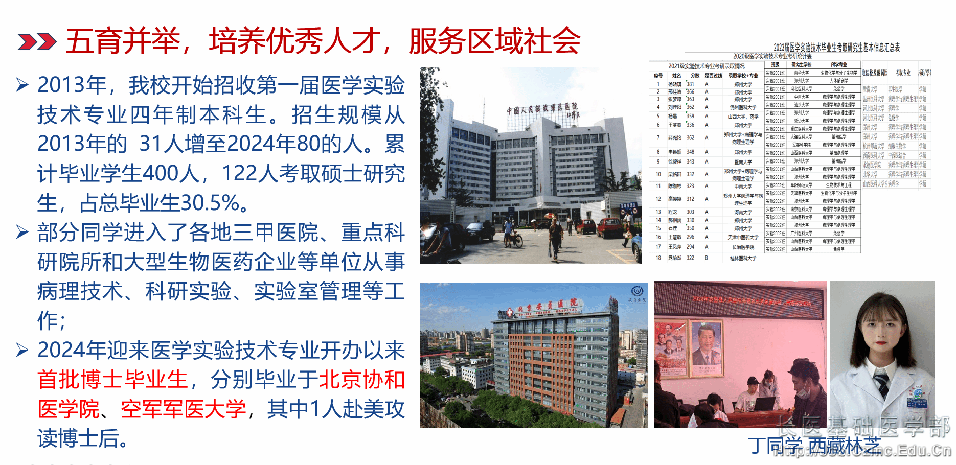 本专业员工考取的研究生分布在北京协和医公司、中山大学、中南大学、中国药科大学、暨南大学、安徽医科大学、天津医科大学、大连医科大学、郑州大学、山西大学、山西医科大学、昆明医科大学、内蒙古科技大学等院校,部分毕业生目前博士在读。在就业方面,本专业毕业生备受用人单位青睐,就业形势可喜,多数同学进入了各地各级医院、重点科研院所和大型生物医药企业等单位从事临床病理技术、科研实验、科研助理、实验室管理等工作。主要就业单位有:中国人民解放军总医院(301医院)、中国人民解放军第309医院、北京安贞医院、北京航天中心医院、广州中医药大学深圳医院、徐州医科大学附属医院、山西临汾市中心医院、山西同煤集团中心医院等医院病理科及科研实验室;北京协和医公司基础医学研究所、国家蛋白质组研究中心等科研机构;北京中关村生物公司、北京热景生物科技公司、金域检验中心、迪安检验有限公司、上海阿克曼医学检验所、山西尚宁高科技医学检验中心等知名生物科技企业。用人单位均反馈本专业员工基础扎实,动手能力强、能吃苦、有敬业精神、进入角色快。